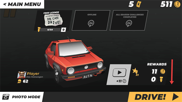 4、在主菜單界面可查看獎勵、車輛等,點擊右下角DRIVE開始駕駛,還有照片模式可拍攝車輛。