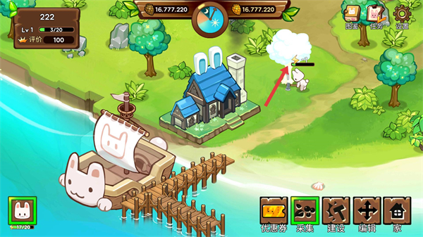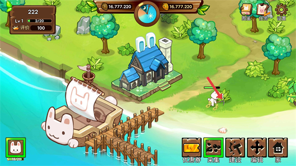 1、操控兔子角色在島嶼場景中移動,可通過船只往返獲取資源,初始階段以探索和收集基礎物資為主。