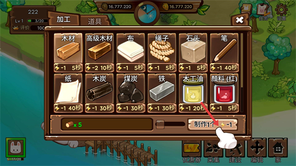 4、進入加工界面,消耗5個木材點擊制作1個,合成基礎道具如高級木材,為后續建設房屋、設施提供材料。
