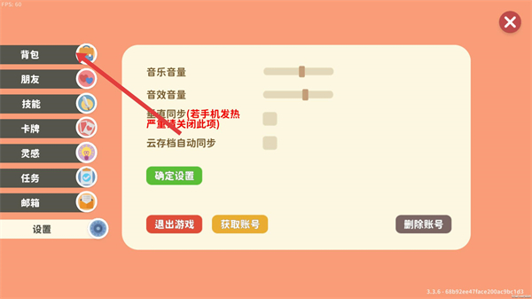 2、進入設置界面,可調整音樂音效音量、通知權限等參數,也可進入背包,查看任務等。