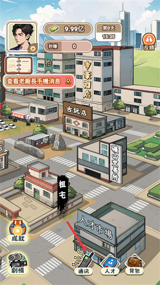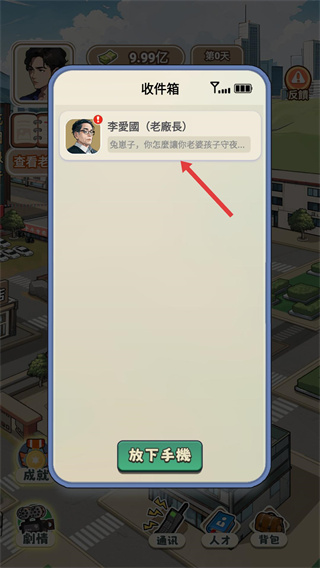 1、進入主界面后,先關注查看老廠長手機消息的提示,點擊通訊入口查看信息可推進劇情。