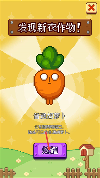 2、獲得普通胡蘿卜長有五官的基礎作物,點擊炫耀記錄該作物的收集,積累農場圖鑒內容。