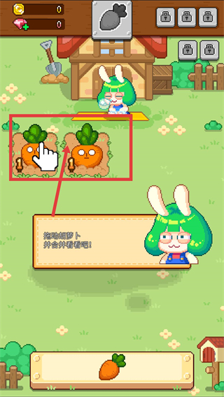 3、拖動兩個相同的普通胡蘿卜進行合并,可合成更高級的胡蘿卜品種,提升農場作物的等級與收益。