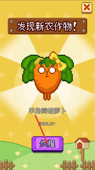 4、發現新農作物羊角辮胡蘿卜,點擊炫耀按鈕可展示該作物,推進農場收集進度。