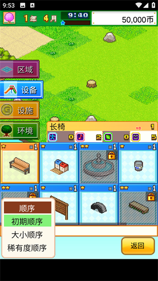 3、選擇設備選項,可查看長椅等設備,還能按順序、大小、稀有度等對設備進行排序管理。