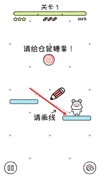 2、關卡1中按提示畫線連接平臺,讓糖果掉落至倉鼠位置,完成給倉鼠糖果的目標。