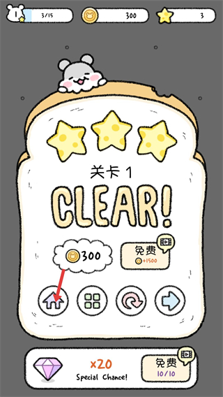 3、通關后點擊房屋圖標返回主界面,領取300金幣獎勵,解鎖后續關卡與內容。