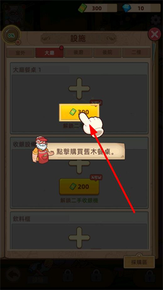 3、在設施界面,消耗資源解鎖實木餐桌等家具,布置餐廳的大廳區域,提升顧客的用餐體驗條件。