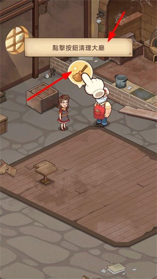 2、進入餐廳內部,點擊按鈕清理大廳區域,移除雜物、打掃衛生,完善餐廳的內部環境,推進翻新進度。