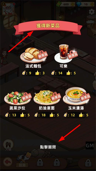 4、完成設施布置后,獲得法式面包、可樂等新菜品,點擊關閉界面,豐富餐廳的菜品品類,推進經營流程。