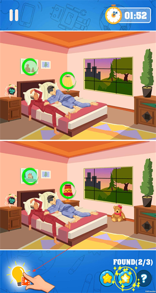 3、在圖中持續尋找剩余差異點,每找到一處都會出現綠色圓圈提示,全部找完后,可獲得星星獎勵,完成該關卡的挑戰。