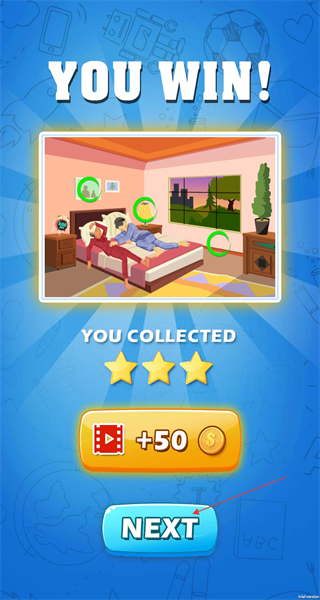 4、關卡勝利后,界面顯示YOU WIN,點擊NEXT按鈕,即可進入下一個更具挑戰性的游戲關卡,繼續尋找差異的樂趣。