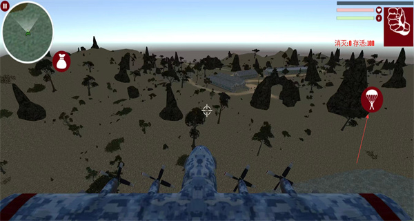 2、玩家在飛機上點擊跳傘按鈕,角色開始從高空向地面降落,準備尋找合適的降落地點。
