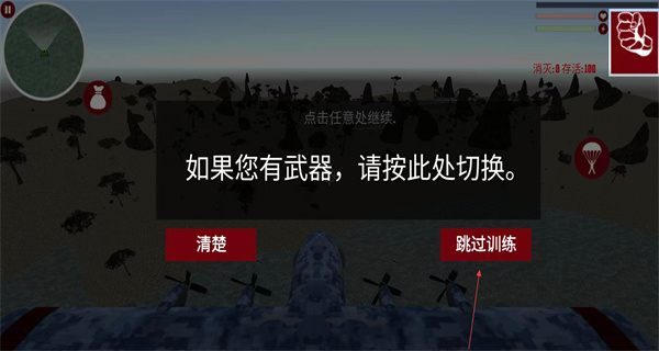 1、進入游戲后,看到操作提示界面,點擊跳過訓練,直接進入游戲場景,開啟生存射擊的挑戰之旅。