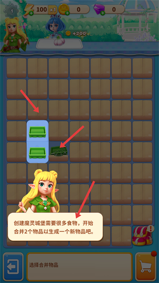 1、創建魔靈城堡需要食物,開始合并2個物品生成新物品,這是獲取資源的基礎操作,通過合并積累食物資源。