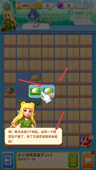 2、再次合成2個物品,可出現蔬菜生產器,有了它能助力魔靈城堡崛起,持續合成可提升物品等級和功能。