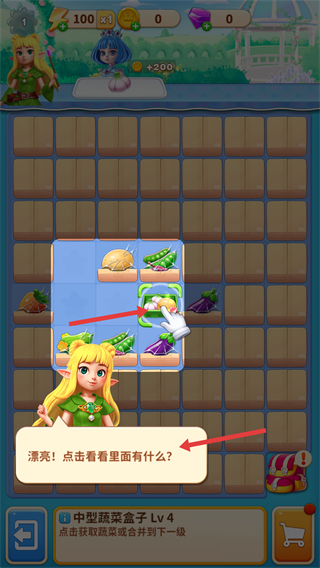 3、點擊合成后的中型蔬菜盒子,查看里面的物品,獲取蔬菜或繼續合并到下一級,豐富資源種類和數量。