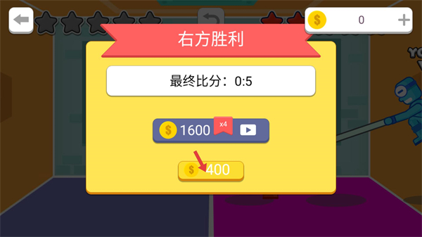4、獲勝后領取金幣獎勵如400金幣,可用于解鎖新角色或場景,推進游戲進度。