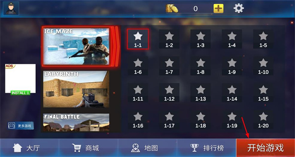 2、在關卡選擇頁面點擊開始游戲,進入冰迷宮場景的第一個關卡,開啟反恐射擊的挑戰,準備與敵人展開對戰。