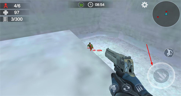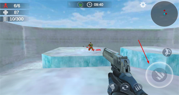 3、進入游戲后,在冰迷宮場景中發現敵人,點擊射擊按鈕攻擊敵人,需時刻關注敵人位置、自身血量及彈藥剩余情況。