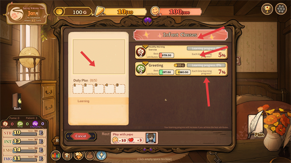 2、在InfantClasses界面,選擇合適的課程如Exercise、Greeting,安排每日計劃,提升女兒的屬性,推動成長進度。