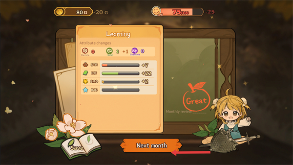 4、每月查看學習屬性變化關注STR、INT等屬性的提升情況,點擊Nextmonth進入下一個月,繼續規劃女兒的成長路徑。