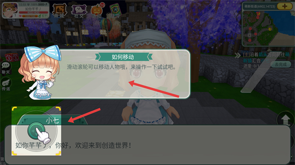 1、按照提示滑動滾輪移動人物,熟悉移動操作,與小七互動,開啟在創造世界的冒險旅程。