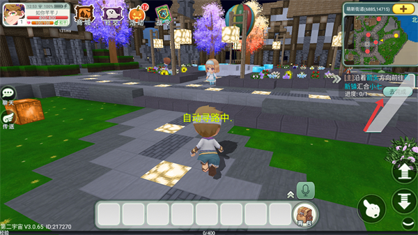 2、跟隨主線任務,沿著箭頭方向自動尋路前往萌新鎮匯合小七,推進任務進度,探索游戲場景。