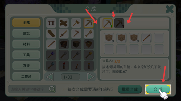 4、在合成界面選擇木鎬,確認所需材料后點擊合成按鈕,消耗銀幣制作木鎬,用于后續挖礦等操作。