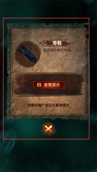 4、獲取壽鞋道具后,可查看其信息,也能選擇觀看廣告解鎖提示,利用提示和道具信息,推進游戲的解謎和劇情發展。