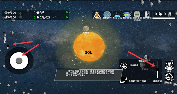2、游戲內左側控制移動右側調切換視角,利用操作鍵在太空場景航行探索SOL恒星周邊收集資源。