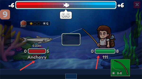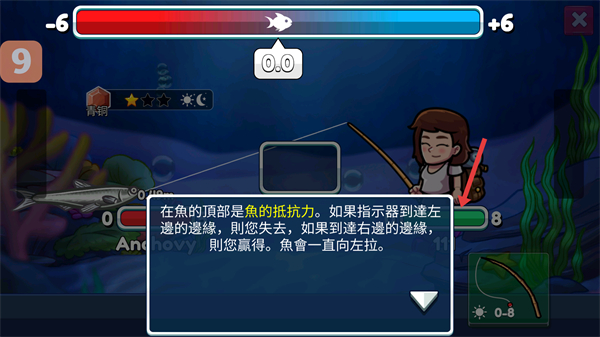 1、在釣魚界面中,觀察魚的抵抗力和自身的釣魚進度條,合理操控以釣到Anchovy魚,積累釣魚經驗,提升等級。