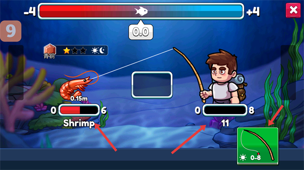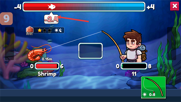 3、在釣魚界面中,使用魚竿釣取Shrimp,觀察魚的抵抗力和自身的釣魚進度條,合理操控以成功釣取,積累釣魚經驗。