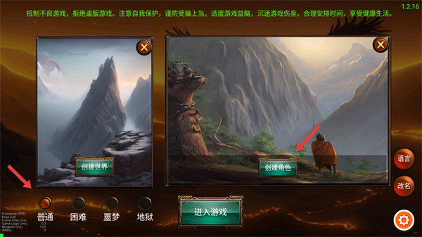 1、進入游戲后,先選擇難度,再點擊創建世界,之后點擊創建角色開始游戲。