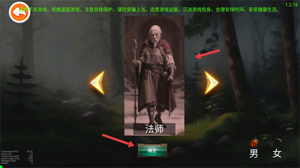 2、在角色選擇界面,通過左右箭頭切換職業,選擇法師后點擊確定,還可選擇性別。