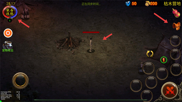3、進入游戲場景后,點擊裝備按鈕查看裝備,控制角色在枯木營地移動,右側有道具可使用。