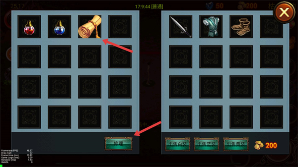 4、打開背包界面,瀏覽藥水,卷軸等物品,點擊整理可整理背包,還能出售物品獲取金幣。
