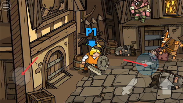 3、戰斗中通過左側虛擬搖桿控制移動,右側按鍵執行攻擊,優先清理雜兵,利用場景障礙物躲避敵方圍攻。