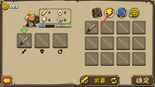 3、在裝備界面選擇武器分類,點擊閃電標識升級技能,完成后點擊確定生效,裝備可提升角色戰斗能力。