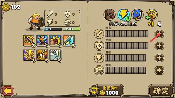 4、升級后在屬性界面分配屬性點每級加2,可提升攻擊、生命等屬性,點擊確定保存配置,增強角色基礎能力。