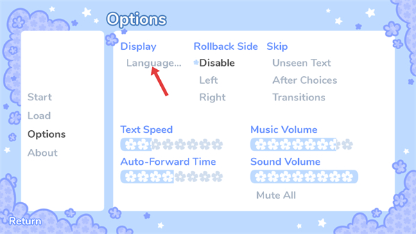 1、主界面有Start、Continue、Options三個選項,點擊Options選項進入設置界面,準備設置游戲語言為中文。