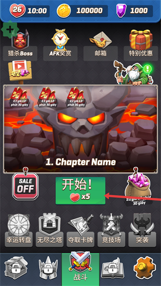1、點擊綠色的開始按鈕,消耗5顆愛心即可進入第一章的戰斗環節,開啟冒險之旅。