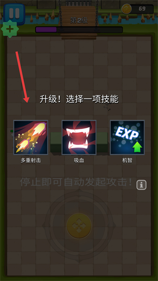 4、升級時會出現技能選擇界面,可在多重射擊、吸血、機智三項技能中選擇一項,提升角色戰力,助力后續戰斗。