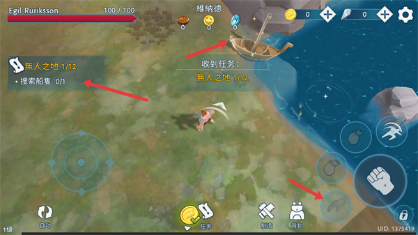 1、接取無人之地任務前往岸邊船隻處,完成搜索船隻的任務目標,推進任務進程。