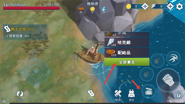 2、到達船隻處后點擊全部拿走按鈕,獲取水瓶、哈克銀、配給品等資源,為后續冒險儲備物資。