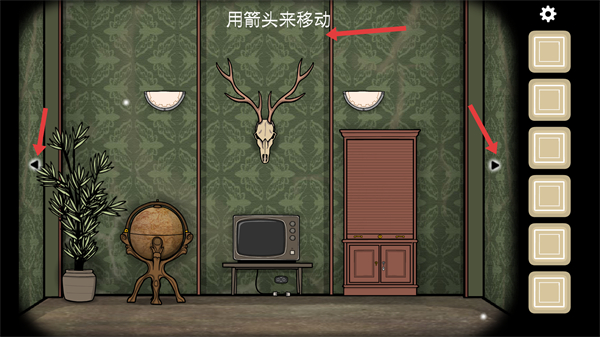 2、進入場景后使用箭頭移動角色,探索房間內的地球儀、電視機、柜子等物品,尋找解謎線索。