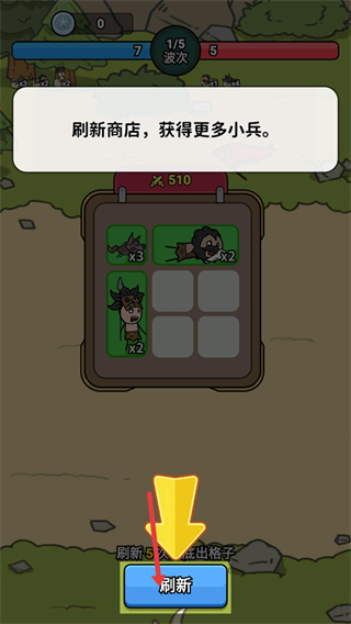 2、點擊刷新按鈕可更新商店的小兵列表,消耗資源獲取更多單位選項,便于搭配更合理的戰斗陣容。