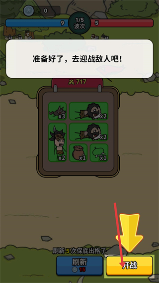 3、完成小兵配置后點擊開戰按鈕,即可進入戰斗環節,需確保背包內有足夠單位以應對當前波次的敵人。