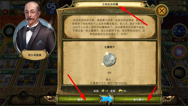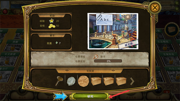 2、進入游戲后點擊研究按鈕,查看場景的任務要求、獎勵及可找到的物品,為尋物任務做準備。