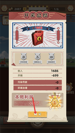 4、開采結束后可以查看收益如加987收益,確認后根據指示點擊確認,獲得的收益用于后續開采。